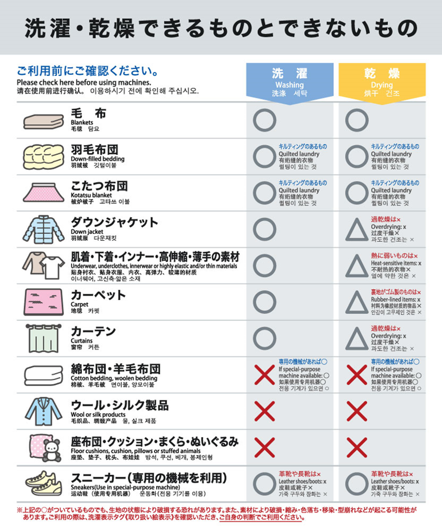 ちなみに、セルフサービスのコインランドリーでは、万が一縮み・色落ちなどのトラブルがあった場合でも保証されません。何を洗うか、洗わざるべきか。見極めが大事です!