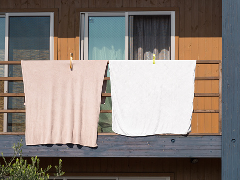 干し方として、ハンガー同士が重ならないように間隔を大きく取り、サイズの大きなバスタオルや衣類は2本の物干しにかけて風が通りやすくします。