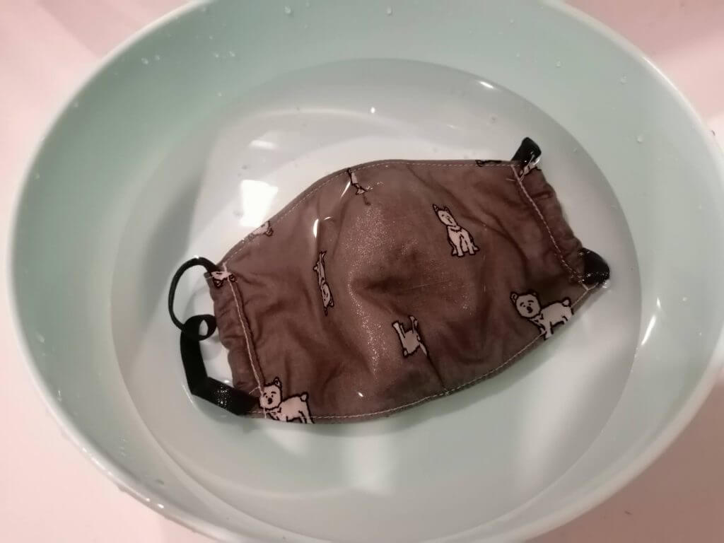 次に、洗面器に布マスクを入れて10分浸します。布マスクを浸すことでより清潔に洗うことができます。